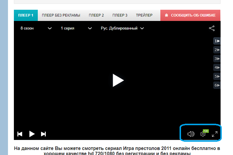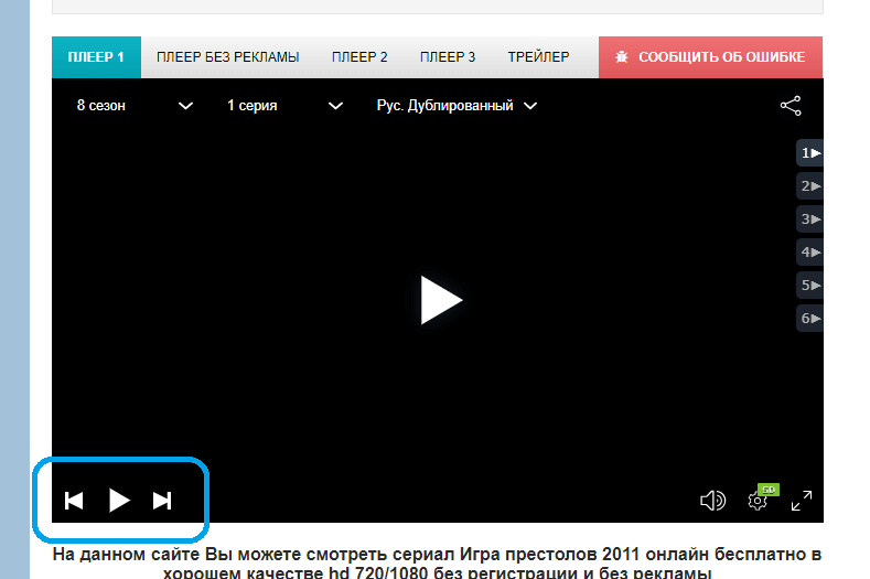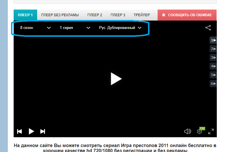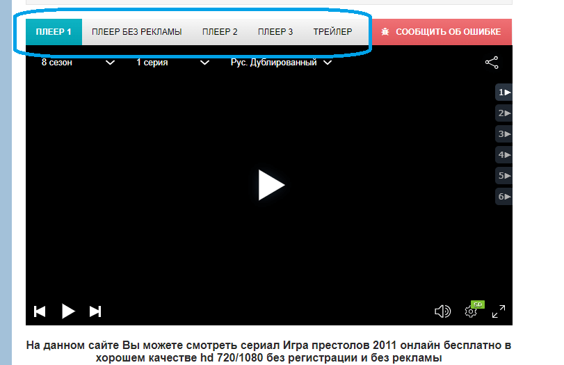 Всё плееры для воспроизведения видео на нашем сайте работают по аналогии с "Плеером 1", за исключением отсутствия в остальных возможности переключать проигрыватель, описанной в пункте "1".