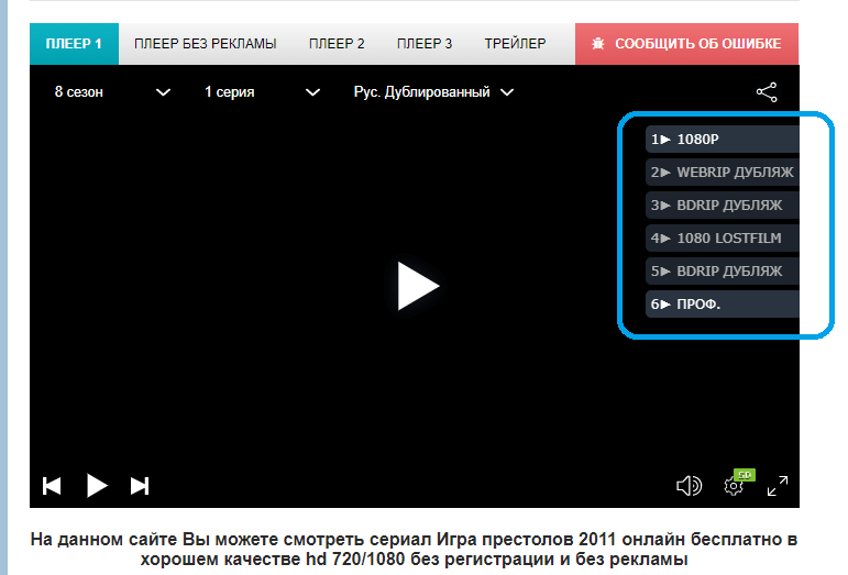 1. Выбор проигрывателя с желаемым качеством изображения и переводом: